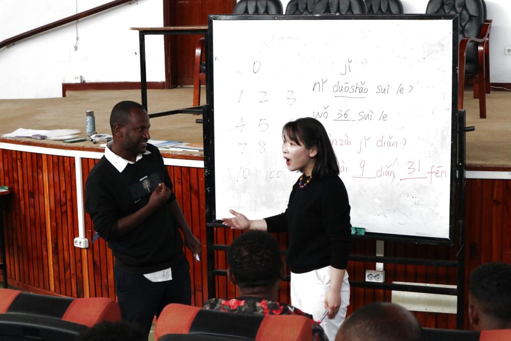 2024年12月2日,在埃塞俄比亞亞的斯亞貝巴大學(xué),孔子學(xué)院老師宋瑞榮(右)在教室與學(xué)生互動。新華社記者 劉方強 攝