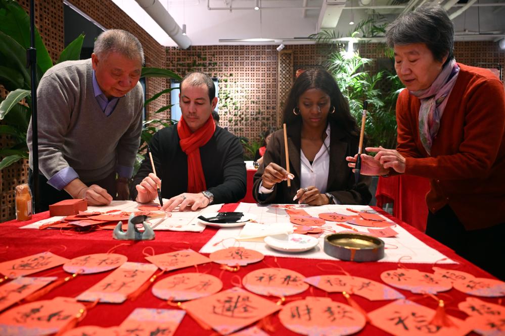 1月17日,外國人在大聯(lián)歡活動中體驗書法。當(dāng)日,“春暖朝陽·巳巳如意”中外居民大聯(lián)歡新時代文明實踐活動在北京朝陽區(qū)左家莊街道舉行。新華社記者 金良快 攝