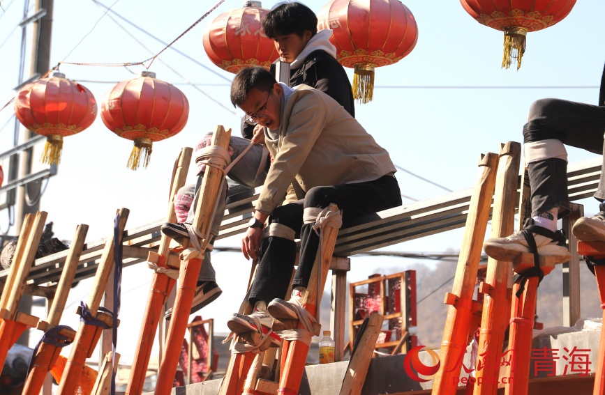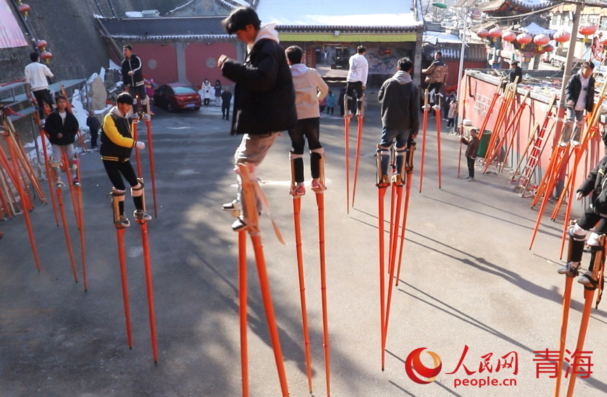 綁蹺、試蹺、定蹺……青海省西寧市湟中區(qū)魯沙爾鎮(zhèn)火神廟,魯沙爾高蹺隊(duì)迎來了春節(jié)前最后一次排練。“從臘月初一到現(xiàn)在二十多天了,今年大家積極性很高,報(bào)名的人也多,排練效果不錯(cuò)?!弊龊脺?zhǔn)備,隨著社火音樂的鼓點(diǎn)舞動起來,魯沙爾鎮(zhèn)高蹺協(xié)會會長李玉龍站在臺階上看著排練隊(duì)形。