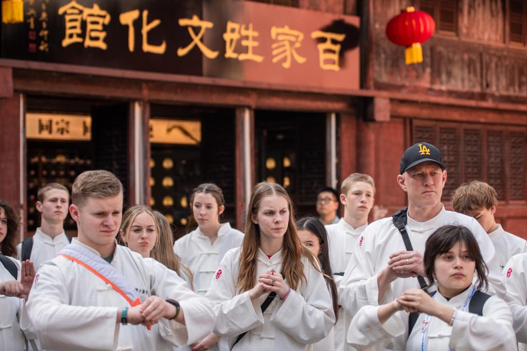 2024年3月22日,美國華盛頓州中學(xué)生代表團(tuán)成員在武當(dāng)山學(xué)習(xí)如何抱拳。新華社記者 伍志尊 攝
