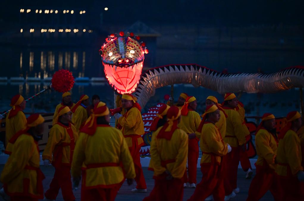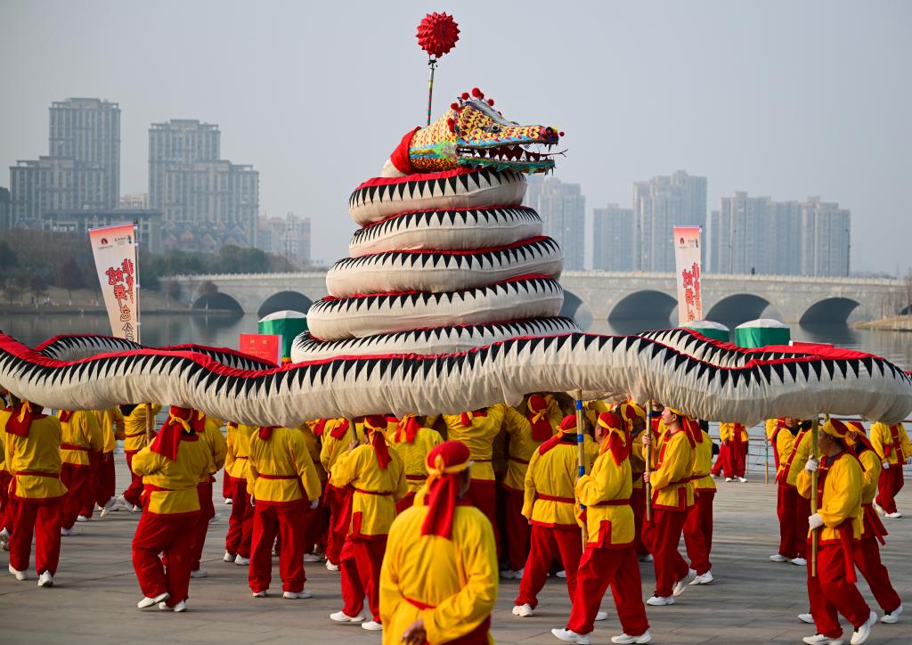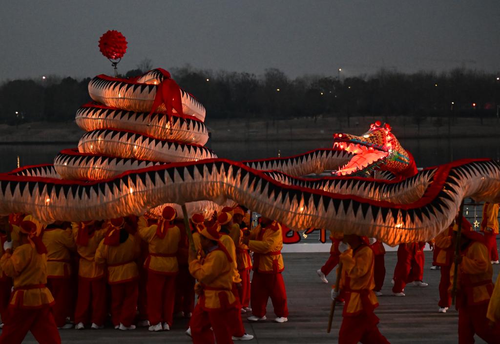“出燈啦!”隨著一聲號令,鼓樂齊鳴,長達(dá)128米的“肥東洋蛇燈”起身游走,光彩靈動。蛇年春節(jié)臨近,安徽省合肥市肥東縣的和睦湖畔,通體流光的洋蛇燈在夜色中時而昂首,似騰空而去,時而垂頭,如蓄勢待發(fā)。