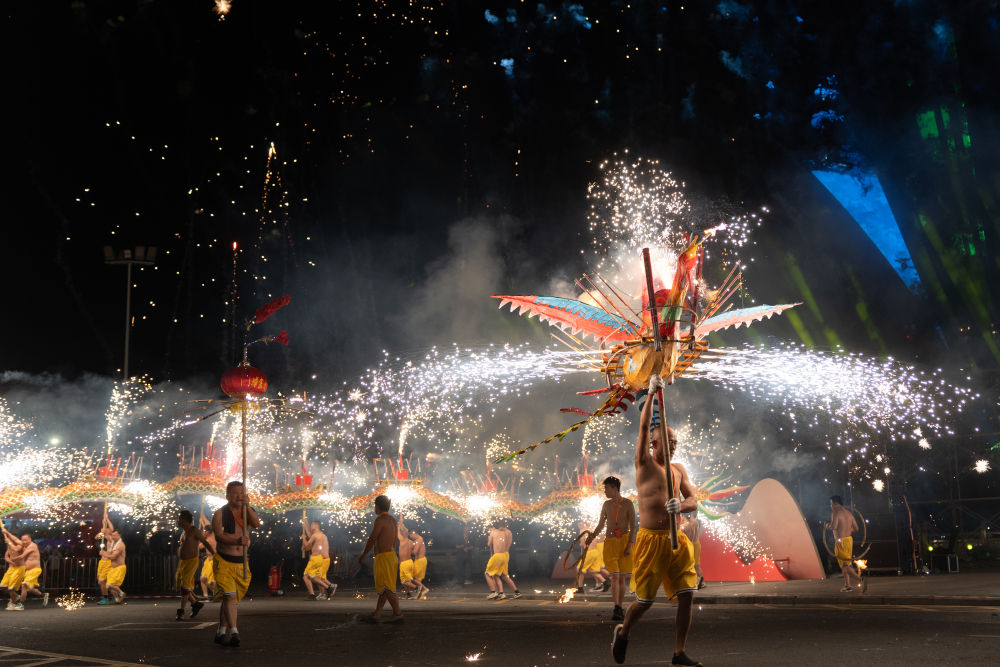 夜幕降臨,點燃觀眾熱情的不僅只有英歌舞。在客家文化的重要發(fā)源地梅州,埔寨火龍表演現(xiàn)場火光沖天,龍影翻騰。