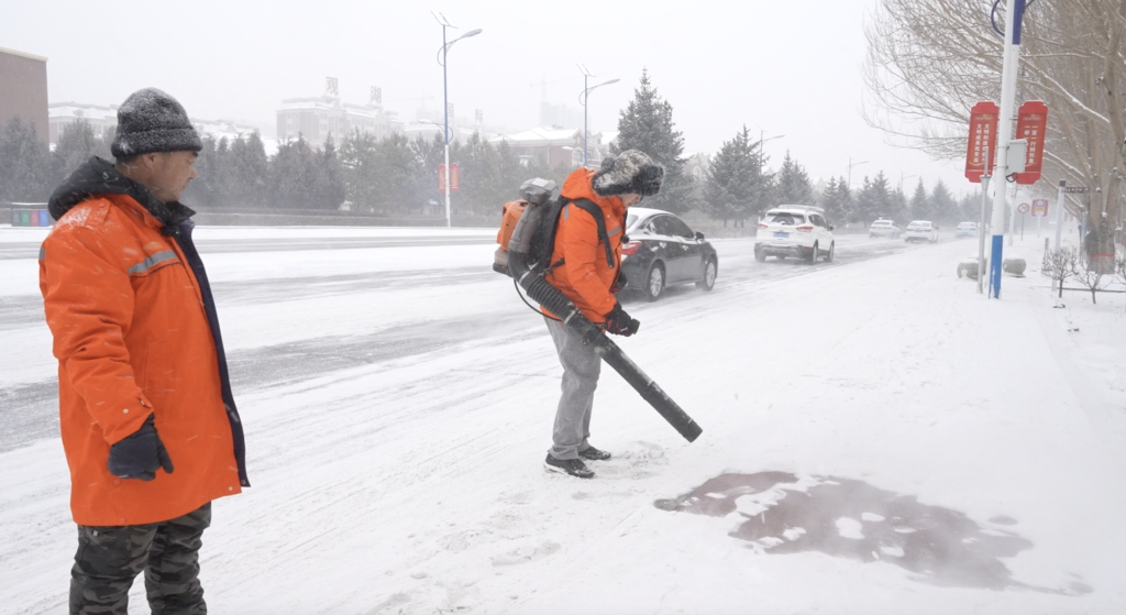 雪越下越厚,風(fēng)機(jī)已難以應(yīng)對。王師傅遞來一把鐵鏟說:“要注意,不要直來直去地鏟,而是要斜著發(fā)力,這樣一次能鏟更多雪,也不容易刮壞地面的紋路?!?/p>