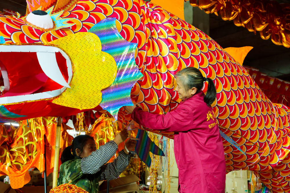 圖為城南龍燈廠的工人們正在加緊趕制龍燈。