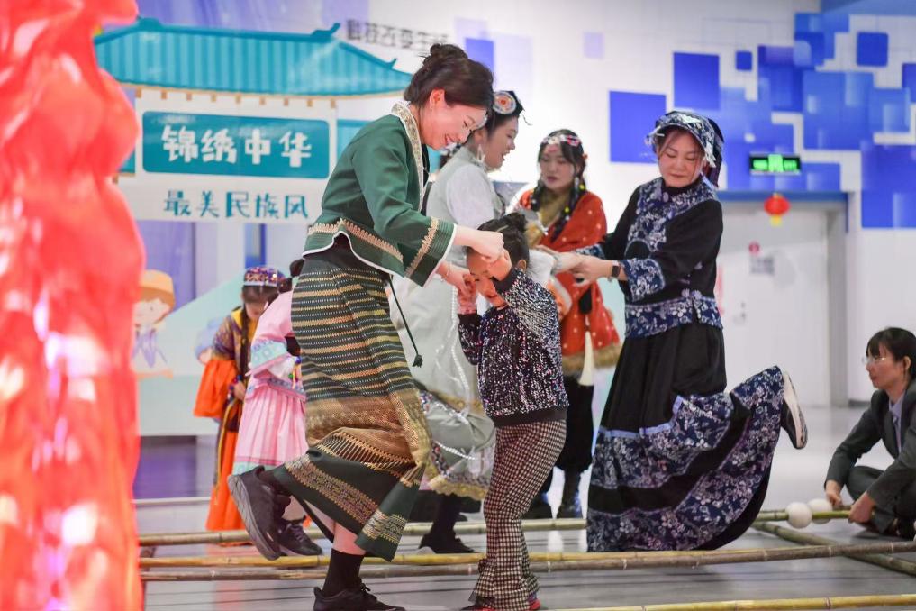 科技輔導(dǎo)員們身著少數(shù)民族服飾,帶領(lǐng)觀眾跳竹竿舞。(寧夏科技館供圖)