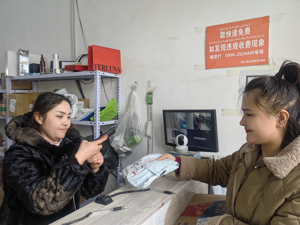 1月18日,在新疆喀什市荒地鄉(xiāng)一快遞代收點,負責(zé)人塔吉尼沙·買買提力(左一)在為顧客掃描快遞單號。新華社記者蔡國棟 攝