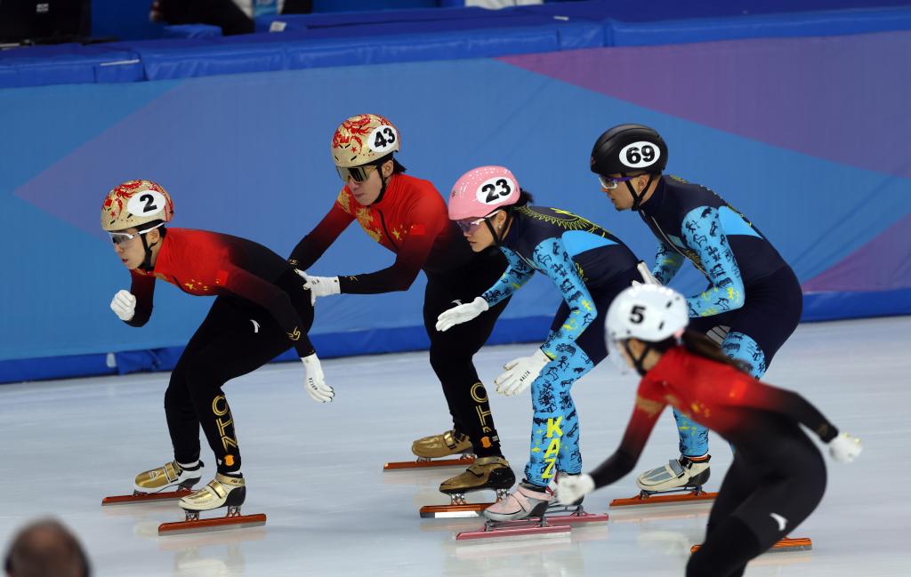 2月7日,中國隊(duì)選手范可新(左一)、林孝埈(左二)在比賽中交接棒。當(dāng)日,第九屆亞冬會(huì)短道速滑混合團(tuán)體2000米接力半決賽在哈爾濱舉行,中國隊(duì)晉級(jí)決賽。新華社記者 丁旭 攝