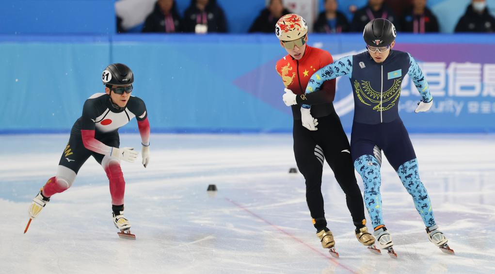 2月7日,中國選手林孝埈(中)與哈薩克斯坦選手阿迪勒·加利亞赫梅托夫(右)在比賽中沖線。當(dāng)日,第九屆亞冬會(huì)短道速滑男子1500米四分之一決賽在哈爾濱舉行。新華社記者 許雅楠 攝