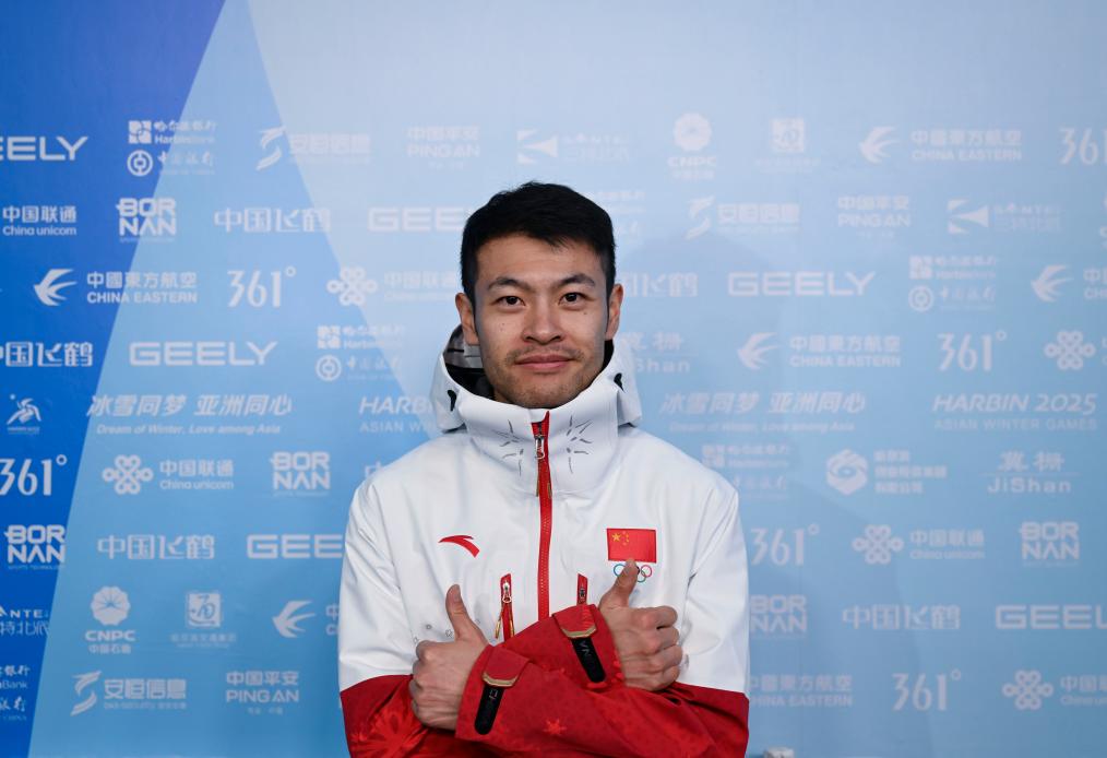 2月6日,哈爾濱亞冬會(huì)開幕式中國體育代表團(tuán)旗手寧忠?guī)r在黑龍江省冰上訓(xùn)練中心速滑館接受集體采訪。新華社記者 陳振海 攝