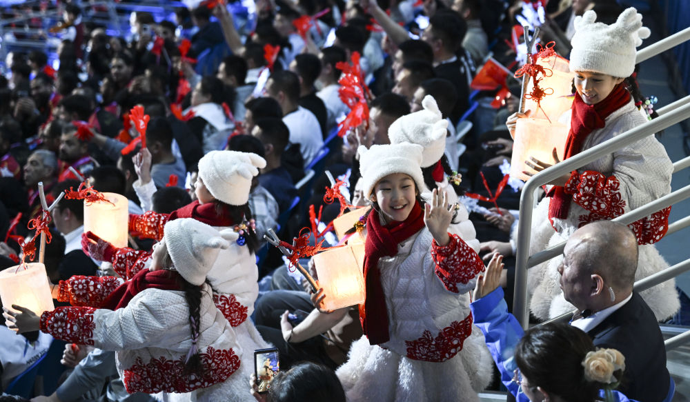 當(dāng)晚,在開幕式分會場冰雪大世界,手提冰燈的孩子們來到占地百萬平方米的園區(qū),與冠軍火炬手一同滑行,見證主火炬點(diǎn)燃。