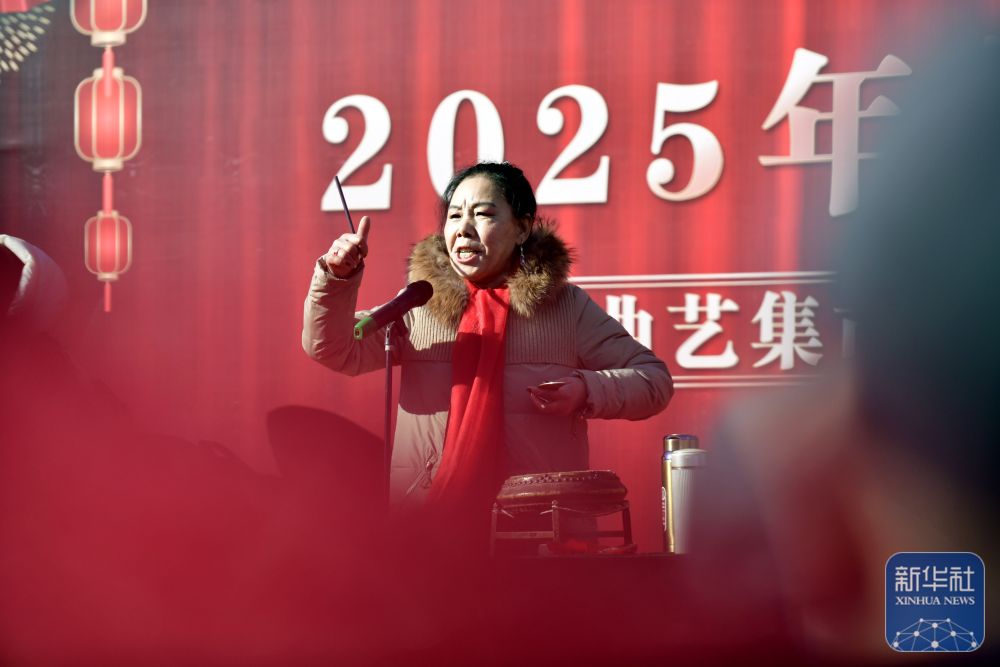 2月9日,河北省滄州市的曲藝藝人朱玉鳳在胡集書會上表演西河大鼓《羅成算卦》。