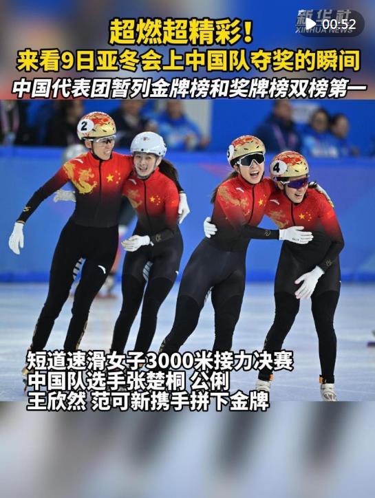 短道速滑女子3000米接力決賽中,中國隊選手范可新、公俐、張楚桐、王欣然攜手拼下金牌;男子5000米接力決賽中,中國隊選手劉少昂、林孝埈、孫龍、劉少林攜手摘得銅牌。
