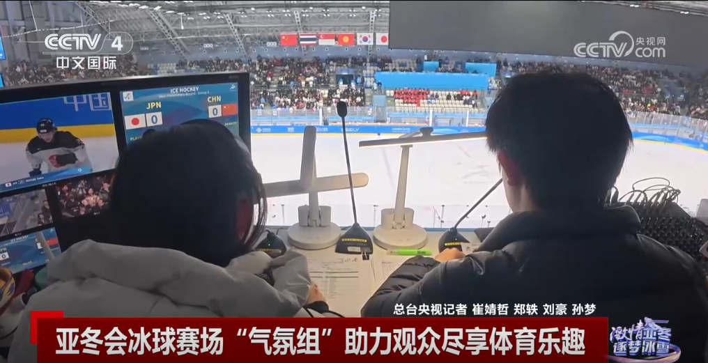 央視網(wǎng)消息:冰球比賽對抗激烈,運動節(jié)奏快、場面精彩。第九屆亞冬會冰球項目賽場之一的哈爾濱冰球館,有這樣一個體育展示團隊,他們被稱為“氣氛組”,通過音樂、燈光、大屏幕、觀眾互動等多手段,讓觀眾一起享受比賽。