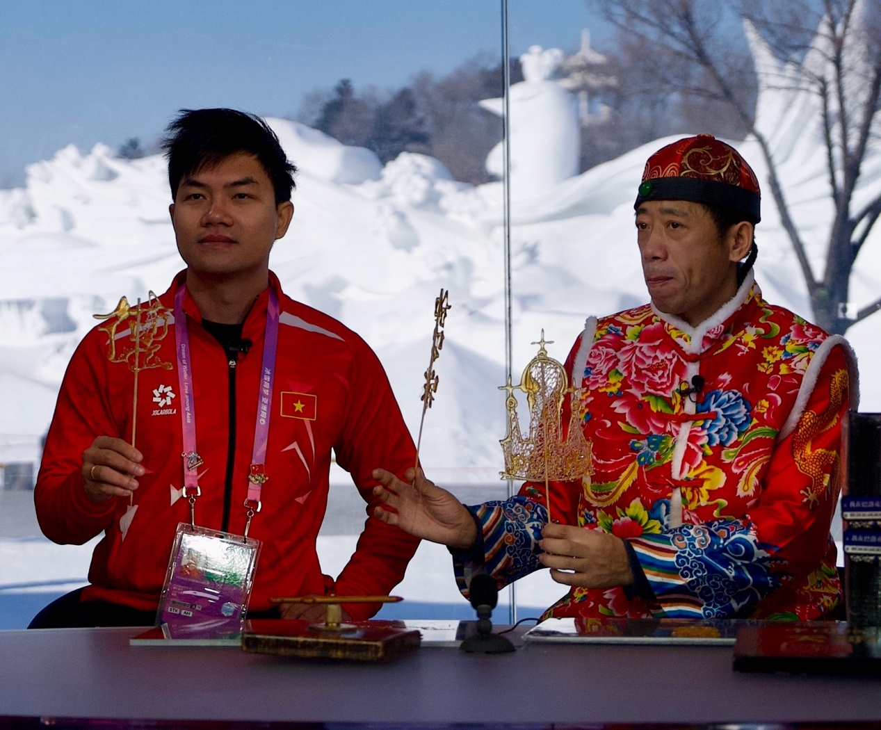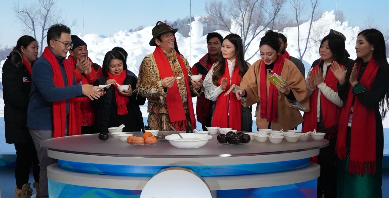 來自蒙古國、泰國、菲律賓、越南、印度、尼泊爾等國的近20位運動員、體育代表團官員和媒體人,在賽場上比拼之后,歡聚在哈爾濱太陽島雪博會中央廣播電視總臺的演播室,在冰天雪地中共慶新春。