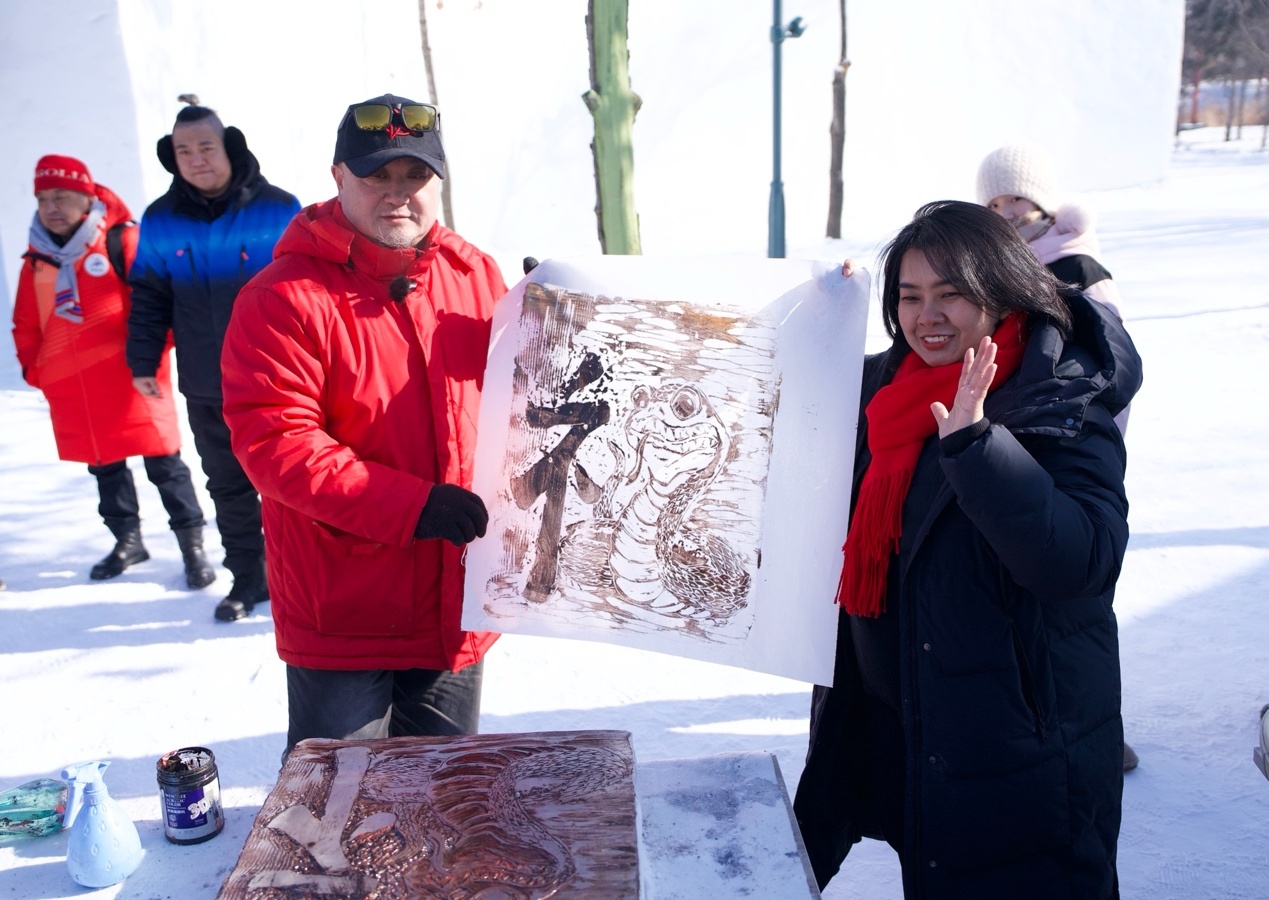 泰國駐華大使館二等秘書王安安在黑龍江省藝術(shù)研究院冰版畫研究院副院長盛琰的指導(dǎo)下,制作出冰版畫《畫蛇添?!?,用蛇的形狀和漢字的偏旁部首組合雕刻出漢字“福”并拓印出來,寄托對中國農(nóng)歷蛇年的祝福。
