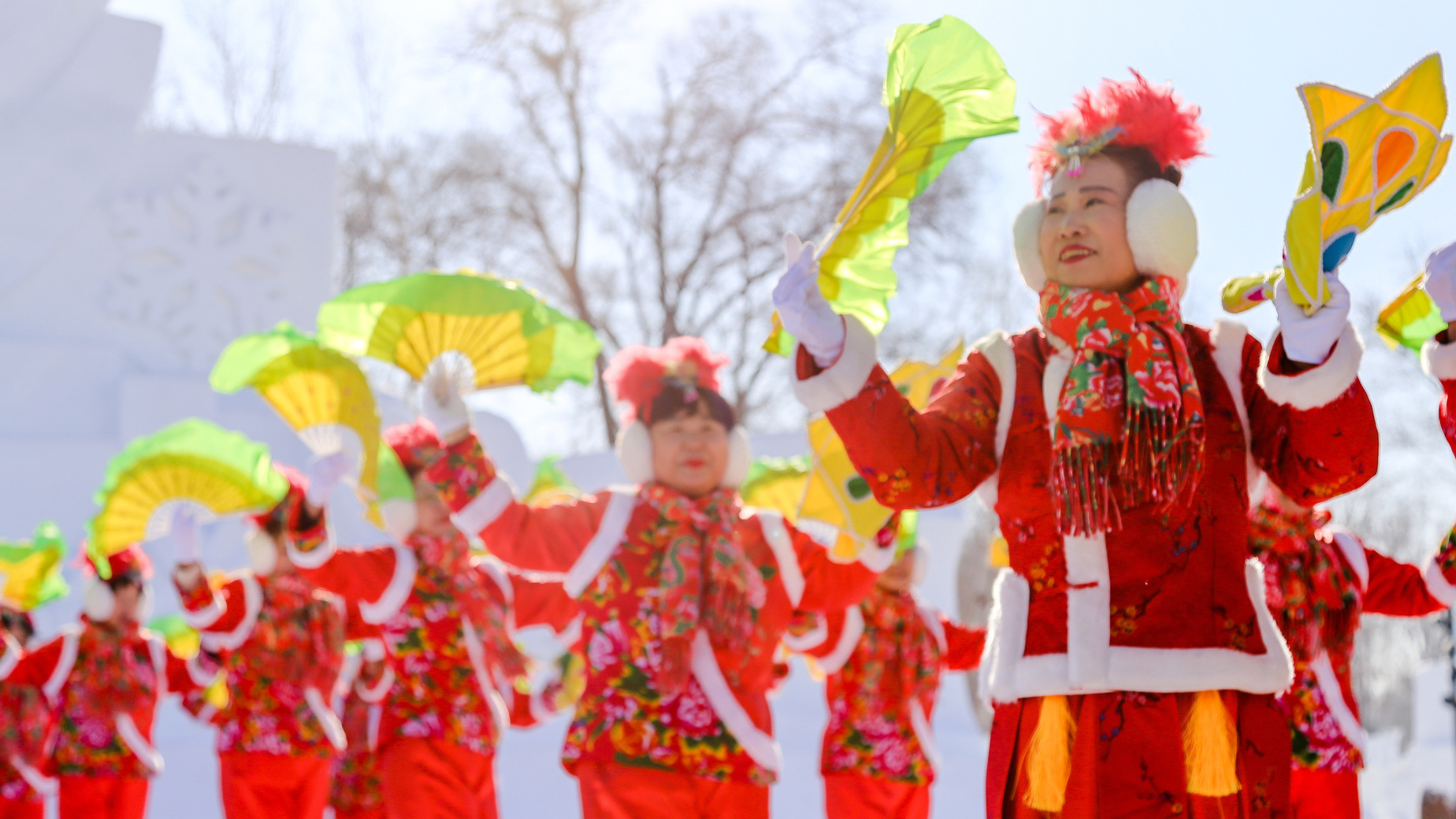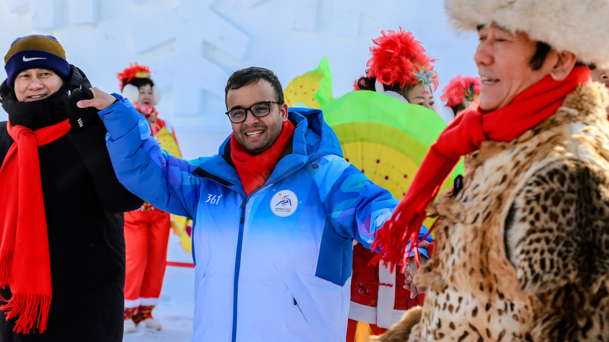 第九屆亞冬會在哈爾濱舉辦期間,一場主題為“當(dāng)亞冬會遇上非遺年——亞洲多國人士冰城同慶新春”的人文交流活動在哈爾濱舉行?;顒赢?dāng)天,在哈爾濱雪博會中央廣播電視總臺演播室前的廣場上,20多人組成的民間秧歌隊在哈爾濱中央大街形象大使甲繼海的帶領(lǐng)下,為各國來賓激情演繹迎賓秧歌舞。