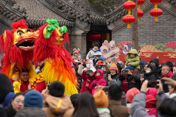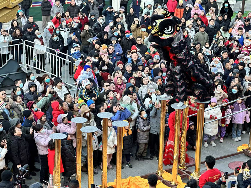 2月2日,在北京東岳廟廟會(huì),門前的北獅表演吸引眾多市民游客駐足觀看。一位家住附近的游客對(duì)記者表示:“過(guò)年期間這里的舞獅表演每天都不一樣,南獅北獅都有。看得真過(guò)癮!”
