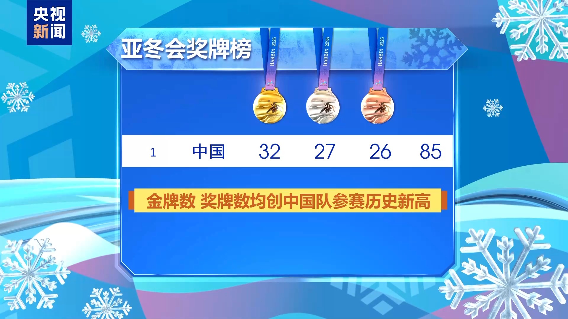 本屆亞冬會中國體育代表團(tuán)參加了全部6個大項(xiàng)11個分項(xiàng)64個小項(xiàng)的比賽,以32金27銀26銅共85枚獎牌,位居金牌榜、獎牌榜首位,金牌數(shù)、獎牌數(shù)均創(chuàng)中國隊(duì)參賽歷史新高。