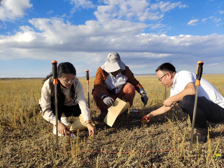 2024年生態(tài)質(zhì)量地面監(jiān)測中,薄文真(左一)和同事正在采集植物樣本。(受訪者供圖)