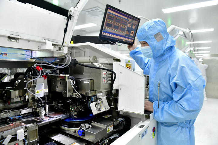 在江蘇昆山丘鈦微電子科技股份有限公司,無塵車間里一條條機械手臂穩(wěn)步移動,將指甲蓋大小的攝像頭拿起、檢測、再放回托盤。