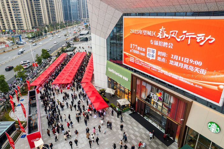 這是2025年2月11日在湖南省長沙市望城區(qū)龍湖月亮島天街商場外坪拍攝的招聘會現(xiàn)場(無人機照片)。新華社記者 陳思汗 攝