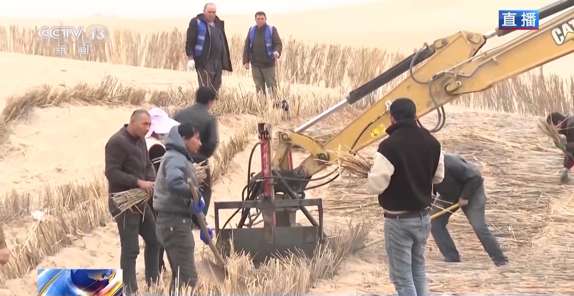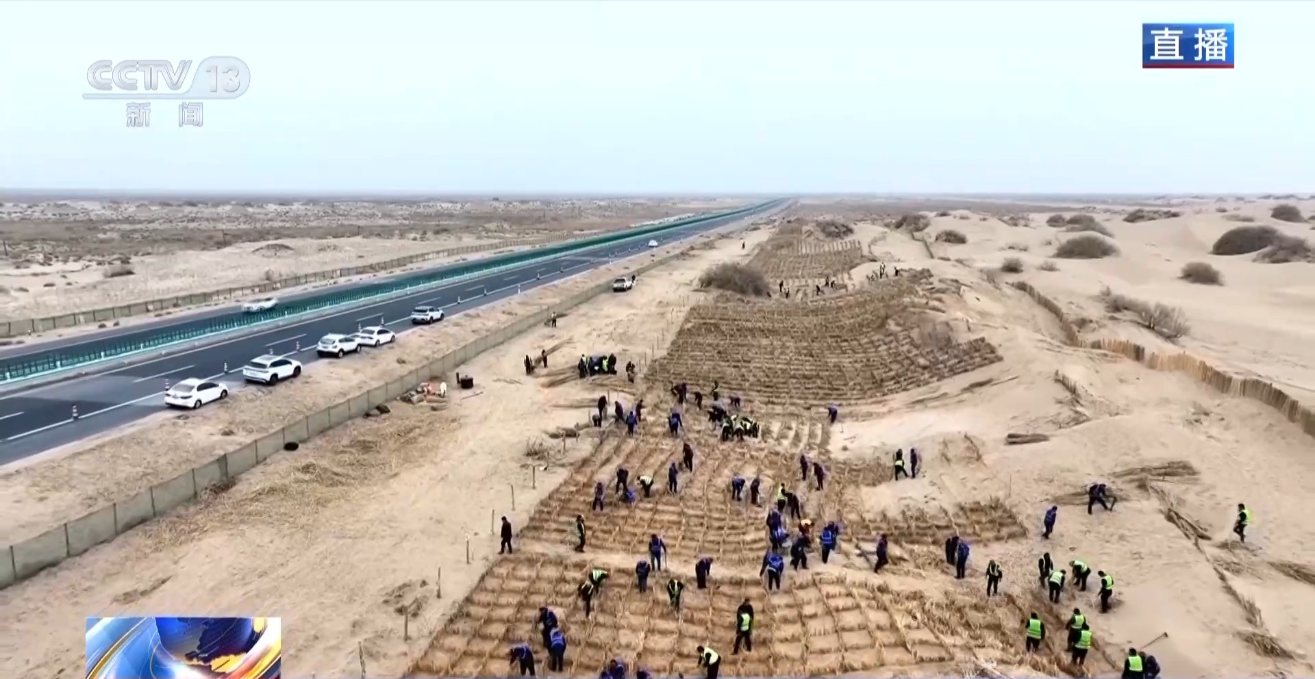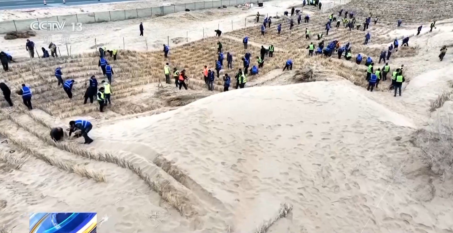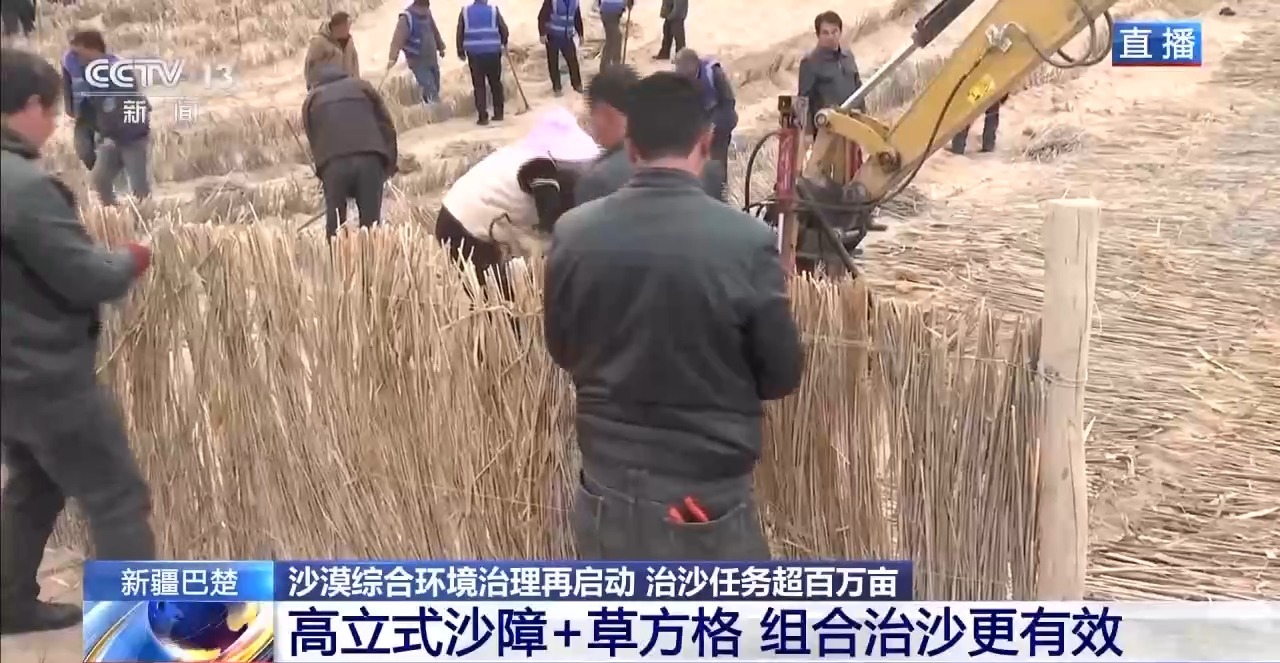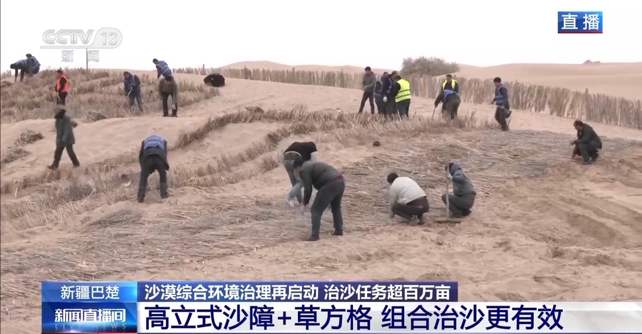 總臺記者從新疆巴楚縣阿克薩克馬熱勒鄉(xiāng)防沙治沙工程施工現(xiàn)場發(fā)回報道。當(dāng)?shù)氐?00多名各族干部群眾人工鋪設(shè)“草方格”,也就是將干蘆葦鋪設(shè)在地面,再壓進(jìn)沙土中,它的主要作用是固沙。
