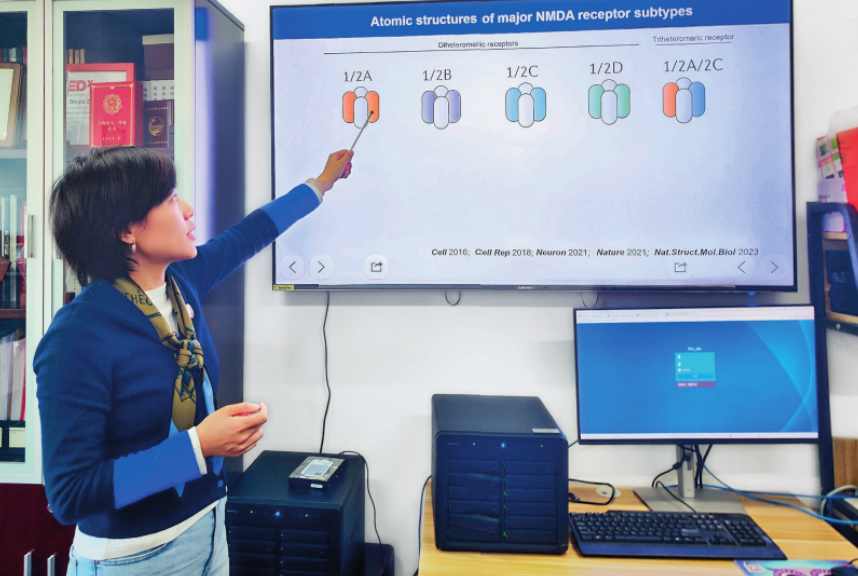 竺淑佳向記者介紹團隊聚焦的NMDA受體相關研究(2025年1月攝)。董雪攝/本刊