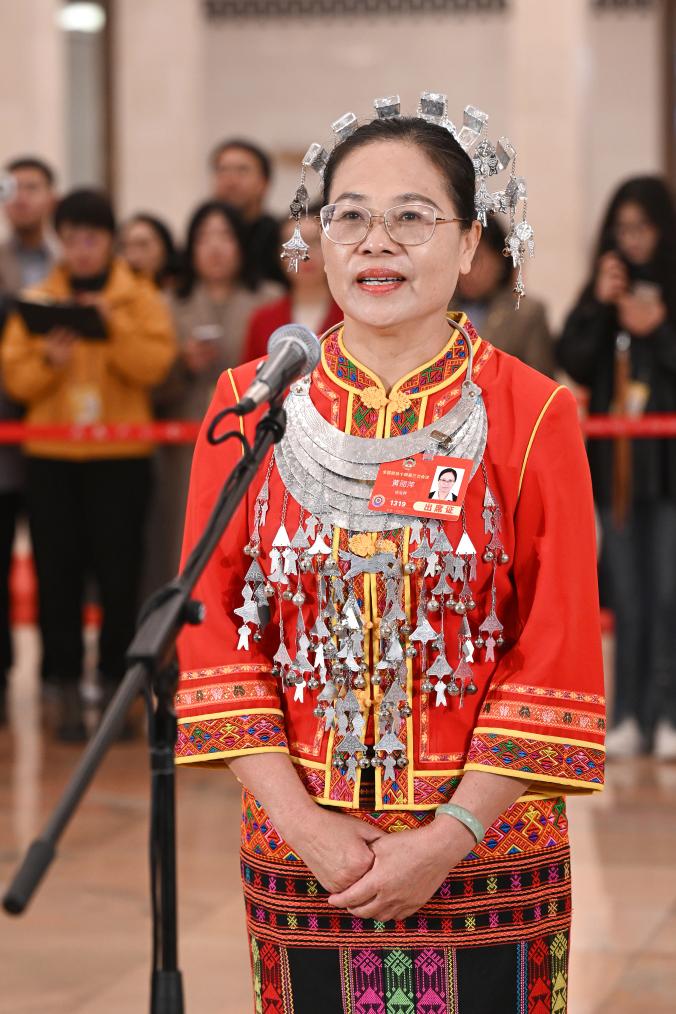 3月10日,全國政協(xié)十四屆三次會(huì)議第三場(chǎng)“委員通道”集體采訪活動(dòng)在北京人民大會(huì)堂舉行。這是全國政協(xié)委員黃麗萍接受媒體采訪。新華社記者 金良快 攝