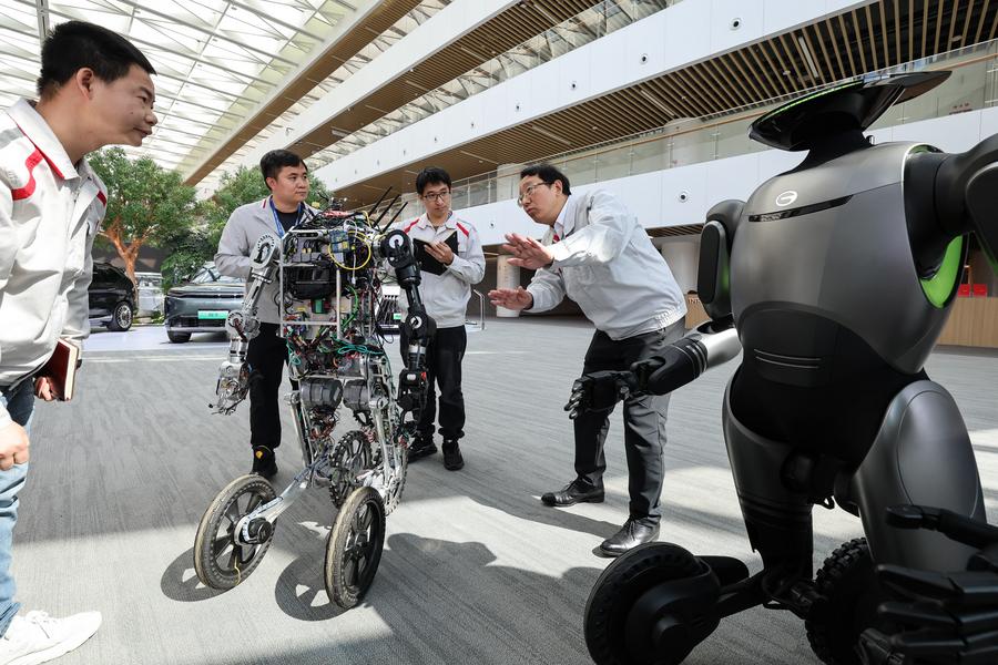 2025年2月24日,全國(guó)人大代表馮興亞(右一)在廣州向廣汽第三代具身智能人形機(jī)器人團(tuán)隊(duì)工程師了解該型機(jī)器人的AI自主控制技術(shù)突破和應(yīng)用場(chǎng)景創(chuàng)新情況。新華社記者 劉大偉 攝