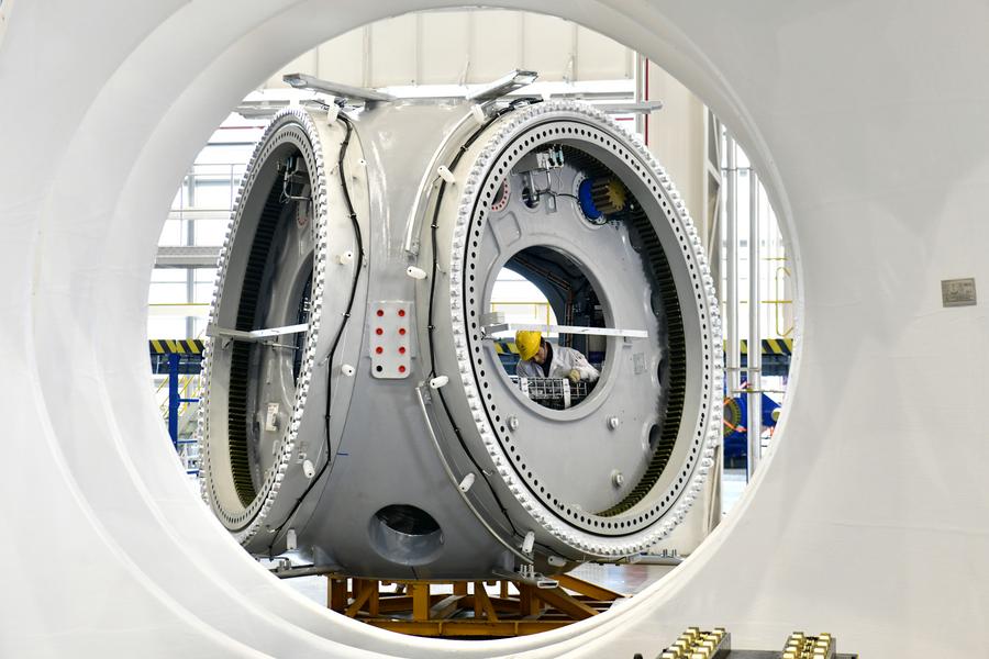 2025年2月22日,在三一重能(日照)風(fēng)電設(shè)備制造有限公司,工作人員在風(fēng)電設(shè)備生產(chǎn)車間忙碌。新華社記者 郭緒雷 攝