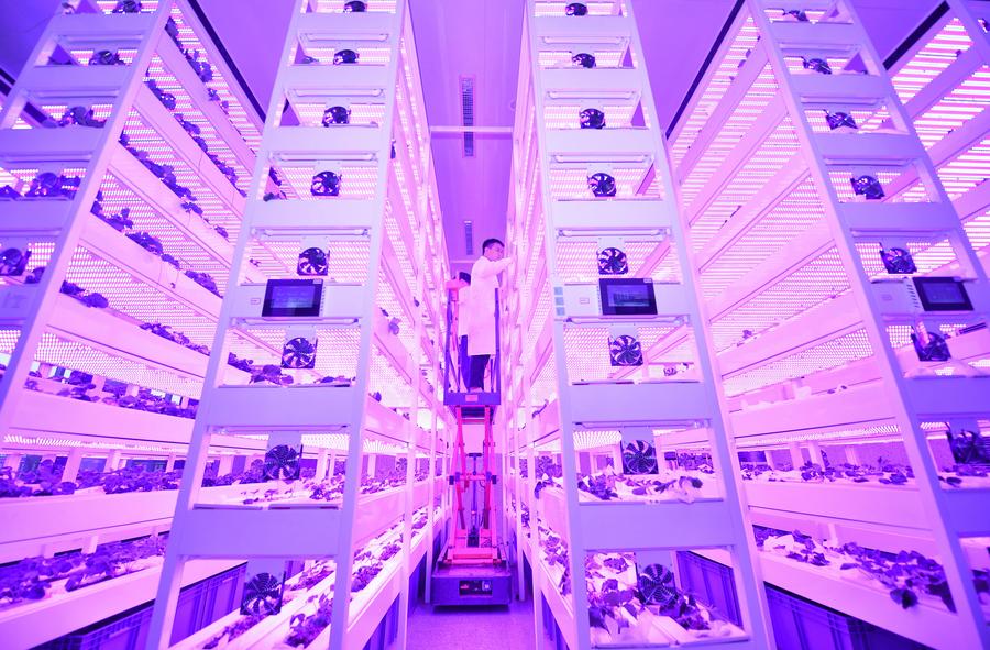 科技人員在中國(guó)農(nóng)業(yè)科學(xué)院都市農(nóng)業(yè)研究所智能植物工廠觀察農(nóng)作物生長(zhǎng)情況(2024年10月16日攝)。新華社記者 劉坤 攝