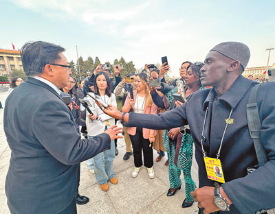 加納通訊社記者斯蒂芬·阿散蒂(右一)在中國全國兩會(huì)期間采訪。本報(bào)記者 馬 菲攝