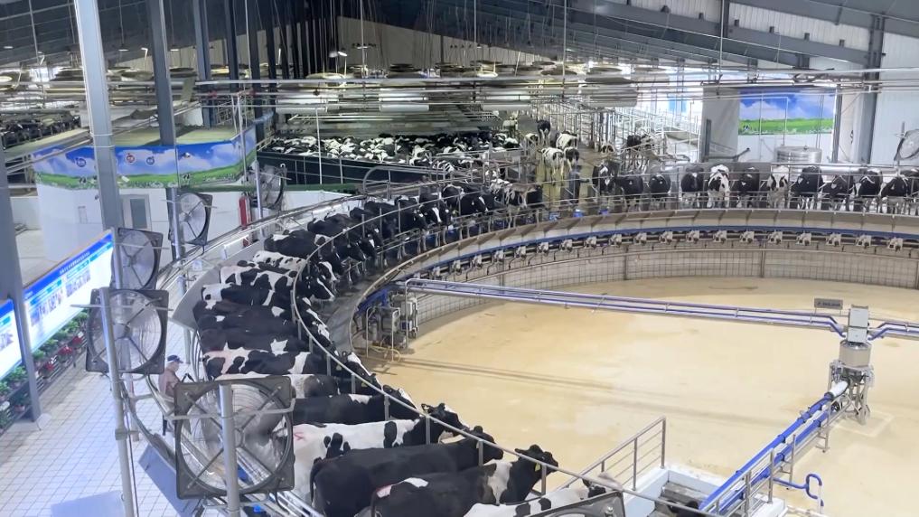 在蜂蜜香氣的吸引下,一頭頭奶牛走向無人擠奶機,機械臂靈敏地進行消毒、套杯、擠奶,新鮮牛奶便源源不斷生產(chǎn)出來。