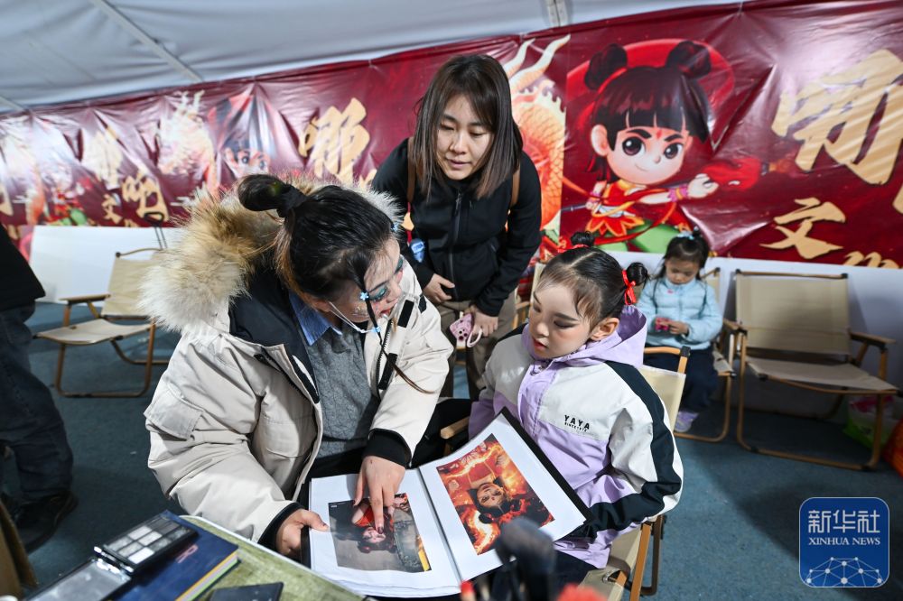 小朋友在天津哪吒小鎮(zhèn)挑選哪吒造型頭飾(3月16日攝)。