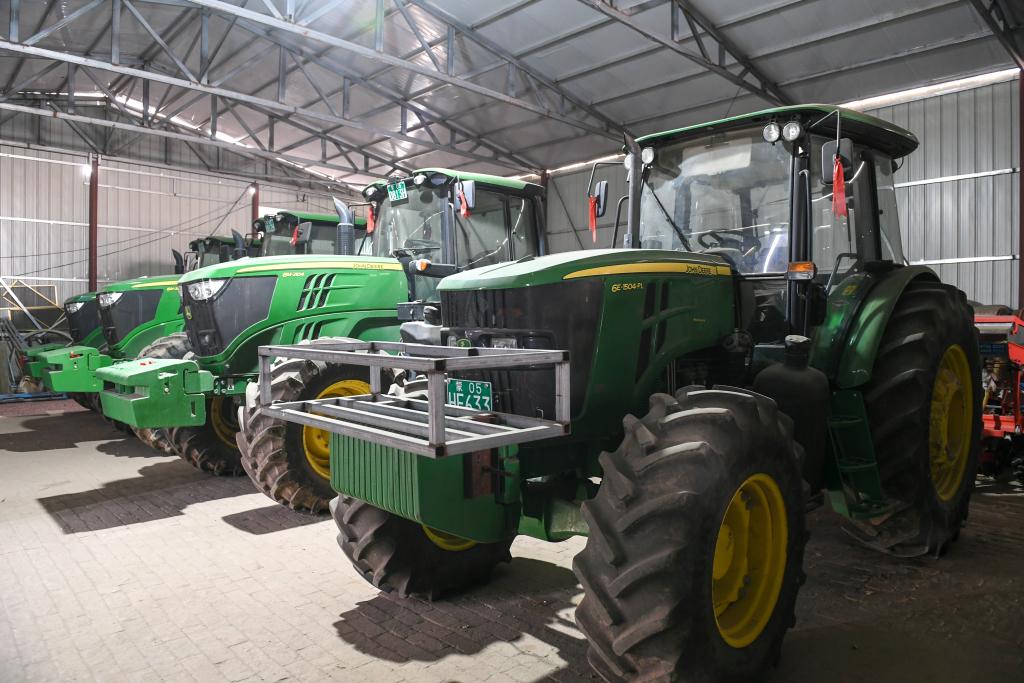 兩臺(tái)嶄新的拖拉機(jī)僅車轱轆就一人多高。陳胡日查說,這種拖拉機(jī)省油、效率高,一天能種300多畝地。
