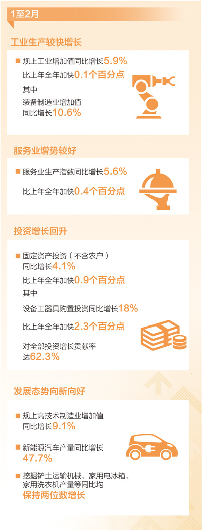 “兩新”政策加力擴圍,市場銷售回升、服務消費擴大。1至2月,社會消費品零售總額同比增長4%,比上年全年加快0.5個百分點。春節(jié)期間,國內旅游出行人次同比增長5.9%。投資方面,制造業(yè)投資較快增長,基礎設施投資增速加快,帶動投資增長回升。1至2月,固定資產投資(不含農戶)同比增長4.1%,增速比上年全年加快0.9個百分點。其中基礎設施投資增長5.6%,比上年全年加快1.2個百分點;制造業(yè)投資增長9%,明顯快于全部投資增長。
