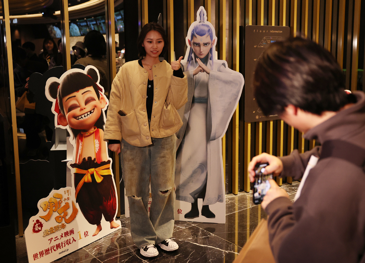 3月14日,在日本東京,一名觀眾在《哪吒之魔童鬧?!啡毡臼子呈胶笈c電影宣傳板合影。(圖片來(lái)源:新華社)