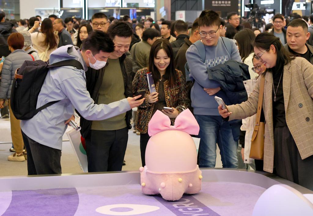 3月20日,參觀者在展會上與“Ai Me智能機器人”互動。當日,以“AI科技、AI生活”為主題的2025中國家電及消費電子博覽會(AWE2025)在上海新國際博覽中心開幕。本屆展會吸引全球千余家企業(yè)參展,全景展示家電及消費電子領(lǐng)域的前沿成果,呈現(xiàn)AI賦能智慧生活的新產(chǎn)品、新方案、新場景。(新華社記者 方喆 攝)