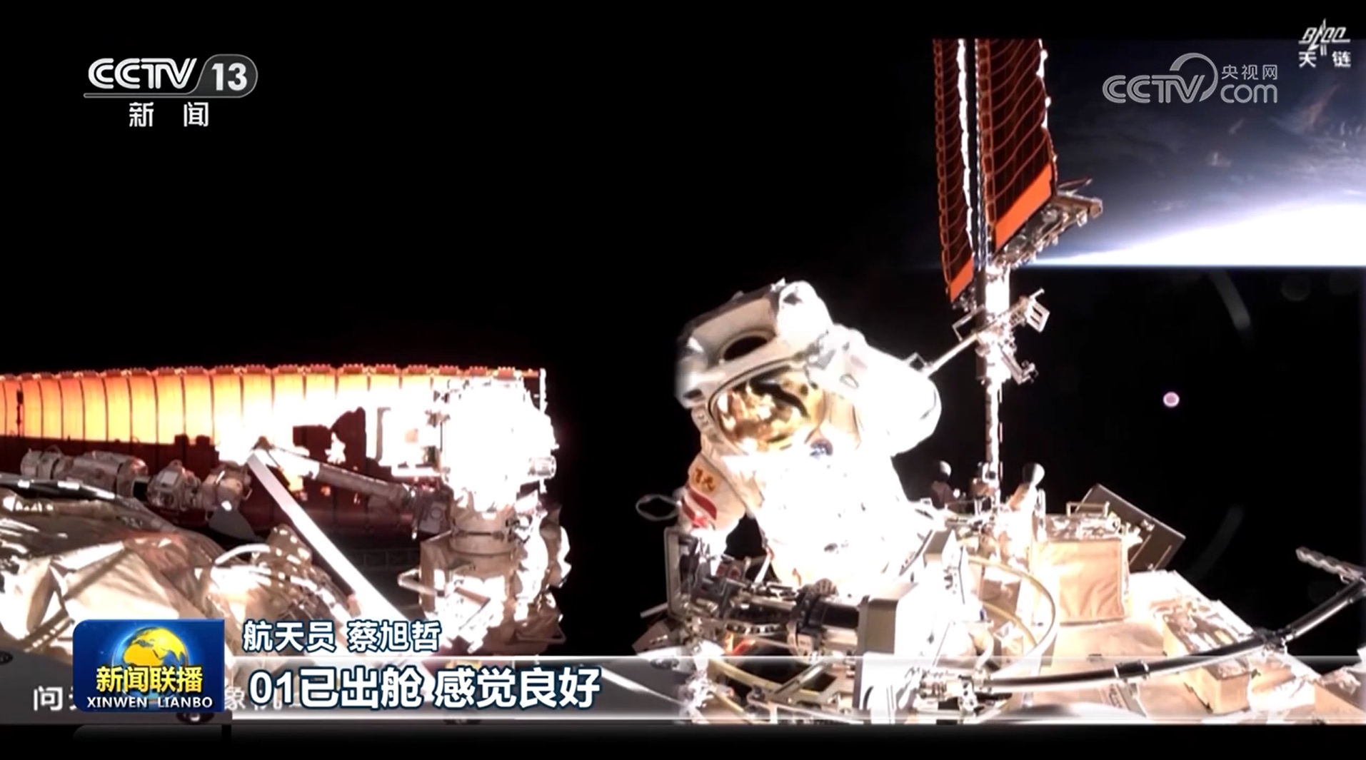 13時(shí)45分,航天員蔡旭哲打開出艙艙門,首先出艙。