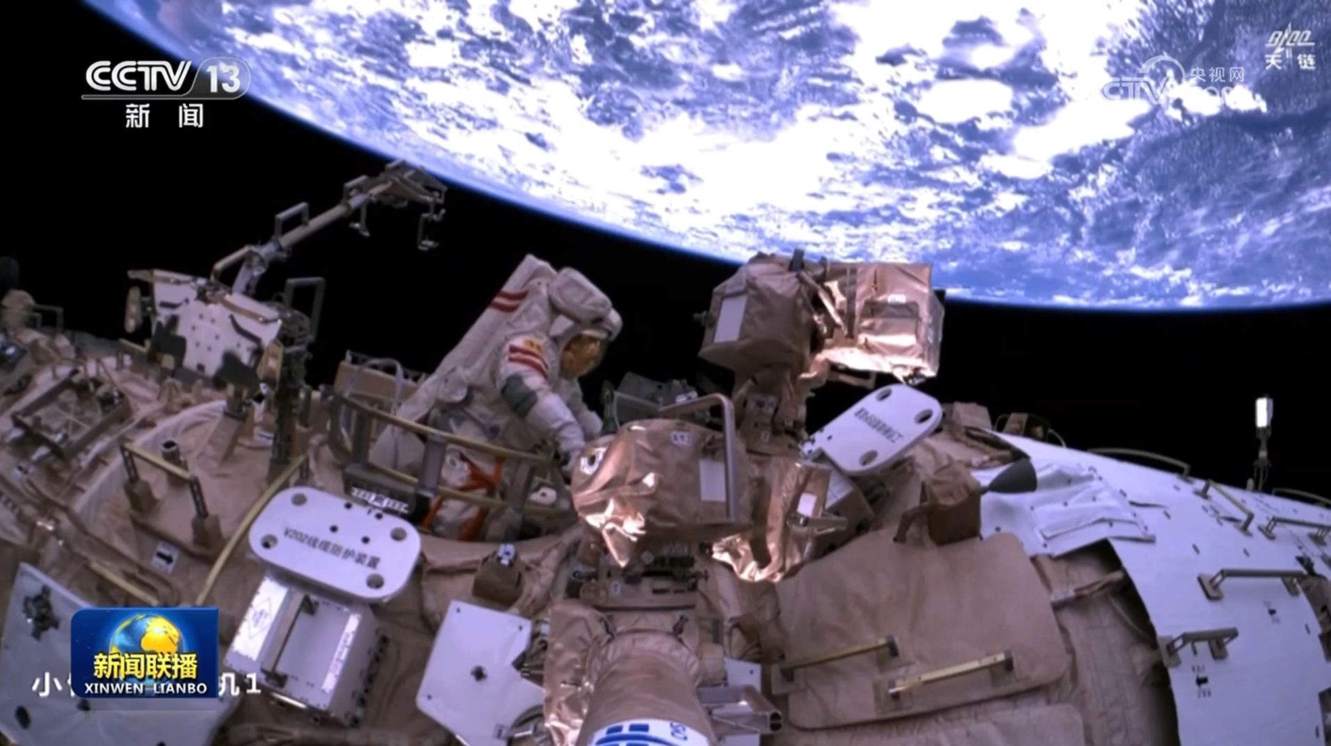 機(jī)械臂運(yùn)動至上下臂點(diǎn),蔡旭哲登上機(jī)械臂。航天員宋令東在出艙艙口將氣閘艙防護(hù)裝置傳遞給蔡旭哲。