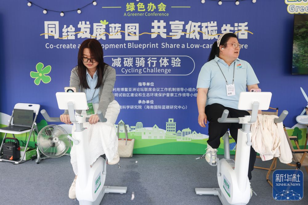 ↑ 3月25日,參會人員在博鰲東嶼島文化公園內(nèi)體驗減碳騎行活動。