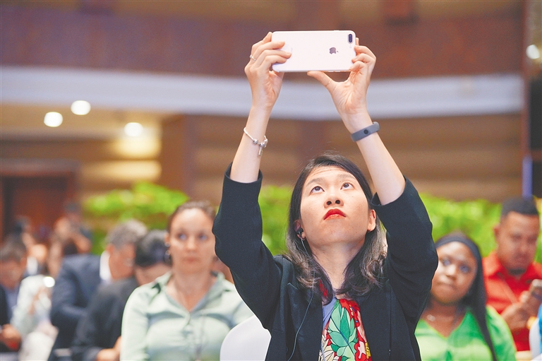 在全球自由貿(mào)易港發(fā)展論壇現(xiàn)場,與會(huì)嘉賓用手機(jī)記錄。海南日報(bào)全媒體記者 王程龍 攝