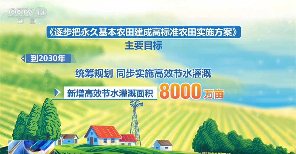 《實(shí)施方案》的主要目標(biāo)是:到2030年,力爭(zhēng)累計(jì)建成高標(biāo)準(zhǔn)農(nóng)田13.5億畝,累計(jì)改造提升2.8億畝,統(tǒng)籌規(guī)劃、同步實(shí)施高效節(jié)水灌溉,新增高效節(jié)水灌溉面積8000萬(wàn)畝;到2035年,力爭(zhēng)將具備條件的永久基本農(nóng)田全部建成高標(biāo)準(zhǔn)農(nóng)田,累計(jì)改造提升4.55億畝,新增高效節(jié)水灌溉面積1.3億畝。