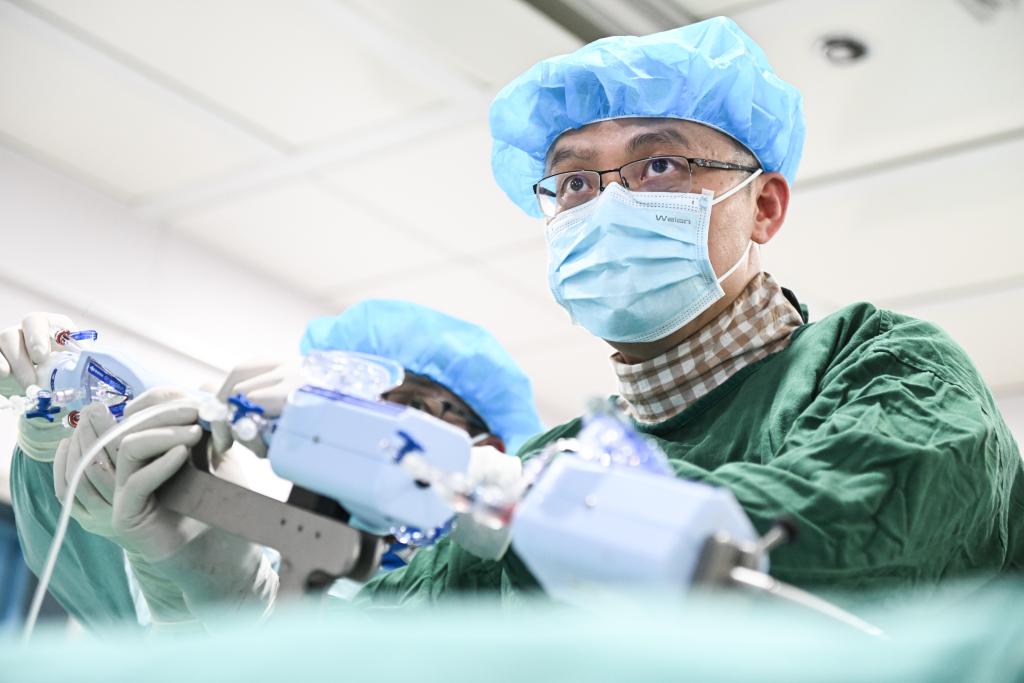 2月20日,在南京市第一醫(yī)院,張俊杰和團隊在心導(dǎo)管室為患者進行經(jīng)導(dǎo)管二尖瓣緣對緣修復(fù)手術(shù)。(新華社記者 季春鵬 攝)