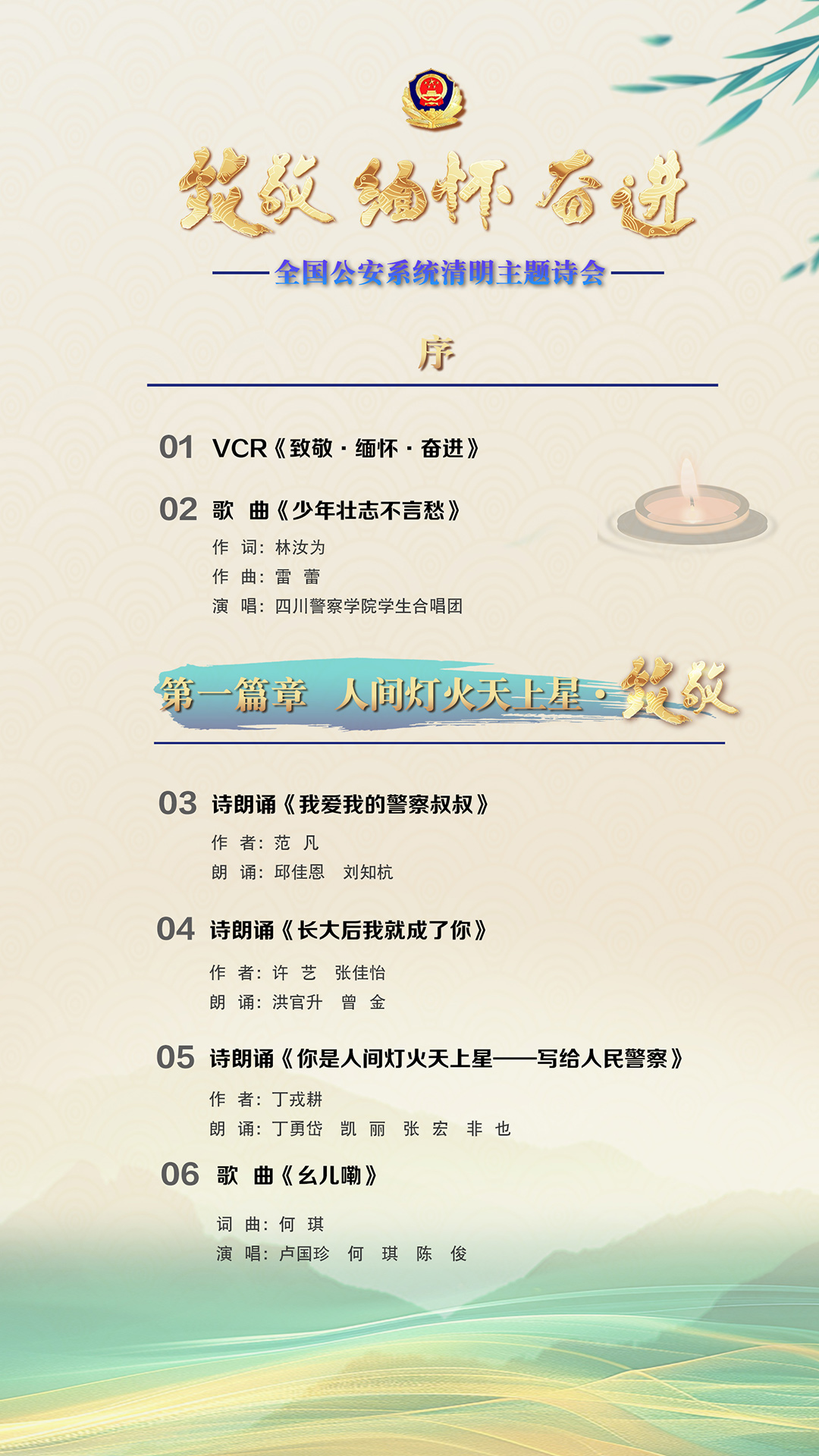 為充分展現(xiàn)全國公安機(jī)關(guān)和廣大公安民警、輔警時(shí)刻銘記習(xí)近平總書記的關(guān)心關(guān)懷,時(shí)刻為黨和人民而戰(zhàn)的忠誠政治本色,深情追憶一年來公安系統(tǒng)涌現(xiàn)的英雄模范感人事跡,激勵(lì)引導(dǎo)廣大公安民警以更加奮發(fā)有為的精神面貌,堅(jiān)決履行好黨和人民賦予的神圣職責(zé)使命,今年清明節(jié)當(dāng)天,公安部新聞宣傳局、全國公安文聯(lián)、四川省公安廳聯(lián)合舉辦“致敬·緬懷·奮進(jìn)”2025年全國公安系統(tǒng)清明主題詩會(huì)。