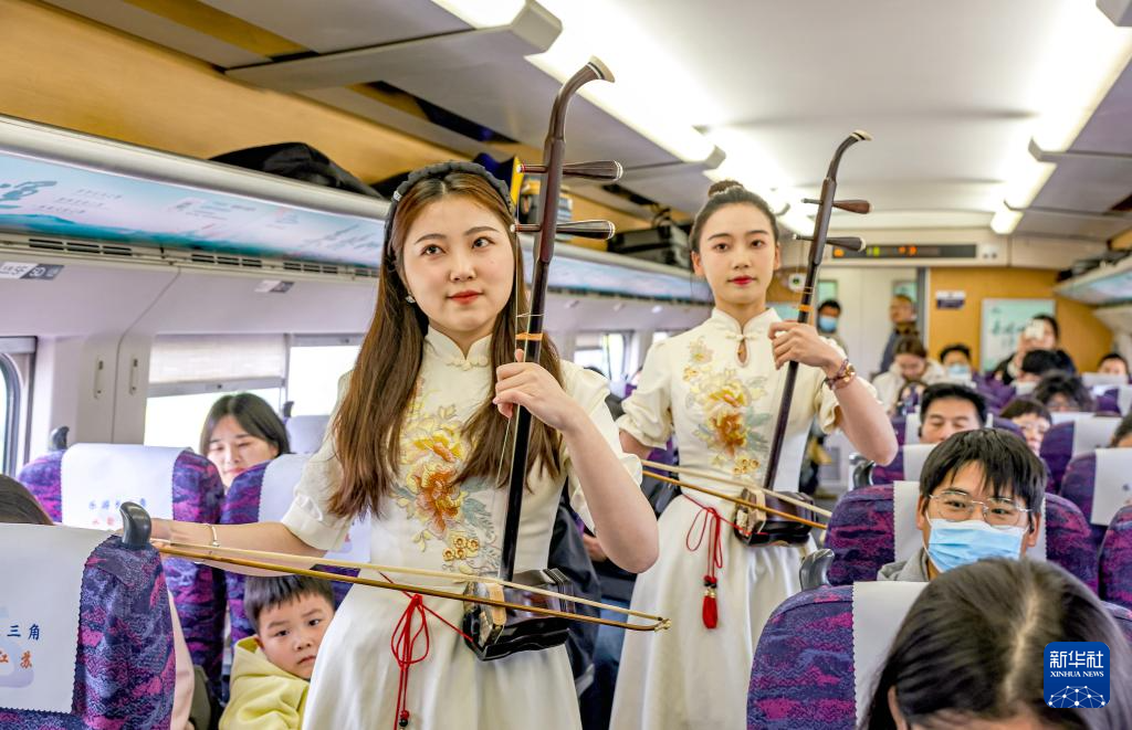 3月29日,揚(yáng)州市文藝工作者在“水韻江蘇”主題旅游列車上進(jìn)行二胡演奏。