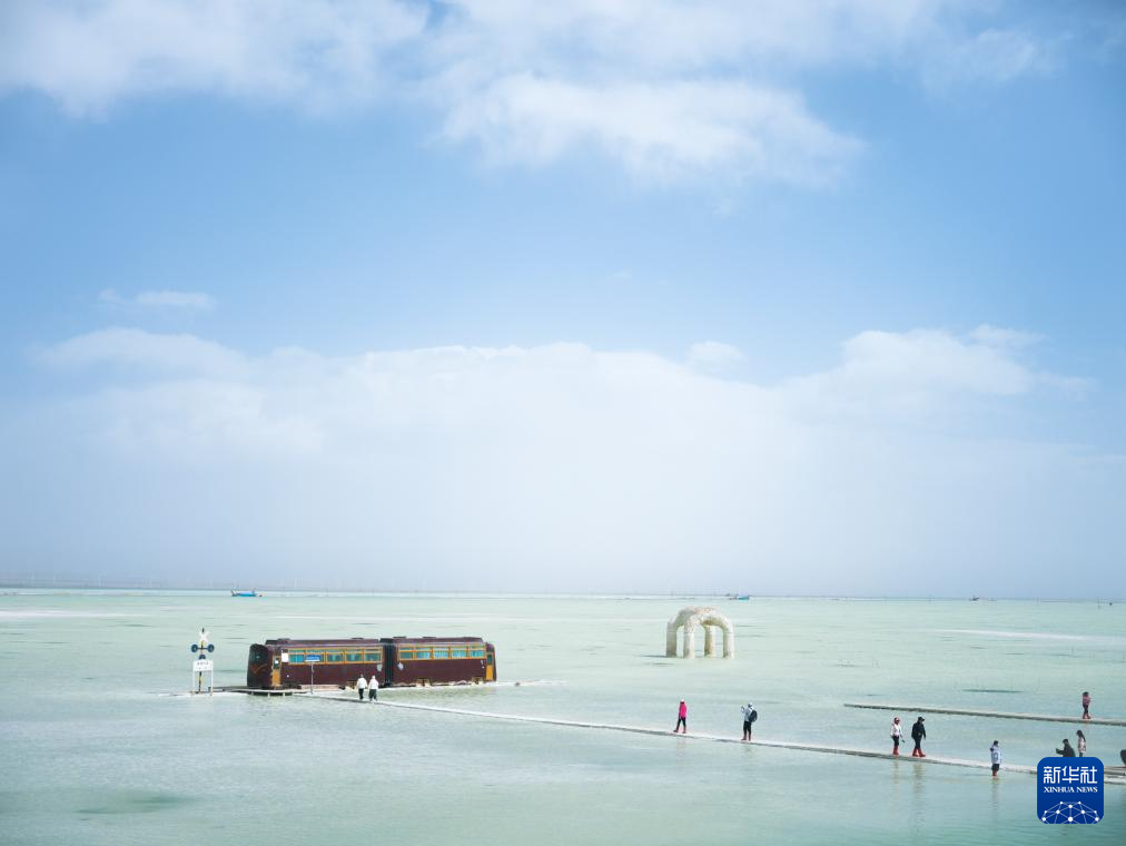3月26日,搭乘入藏旅游專列的旅客在青海茶卡鹽湖景區(qū)游玩。