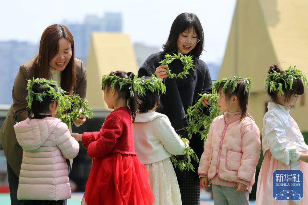↑ 4月3日,四川省樂山市瑞錦幼兒園小朋友和老師一起制作柳帽。新華社發(fā)(李華時攝)
