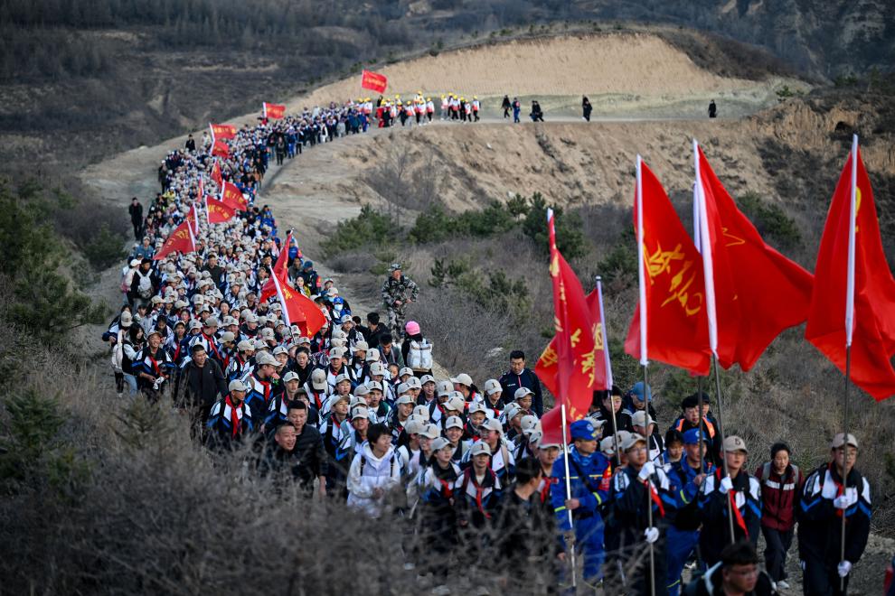 4月3日,參加徒步祭英烈活動(dòng)的師生們翻越黃峁山。