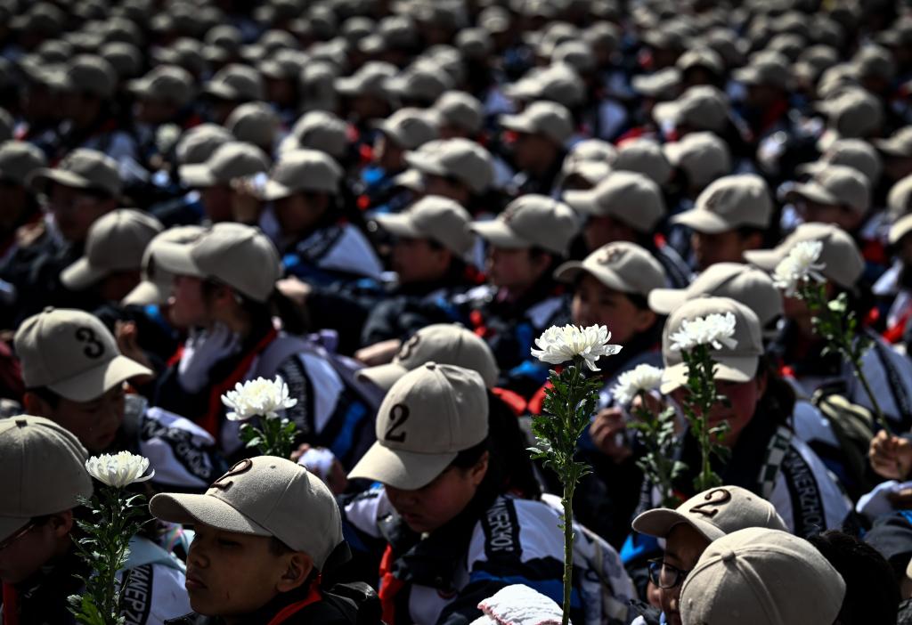 4月3日,抵達(dá)任山河烈士陵園的學(xué)生們手持白菊原地休整。